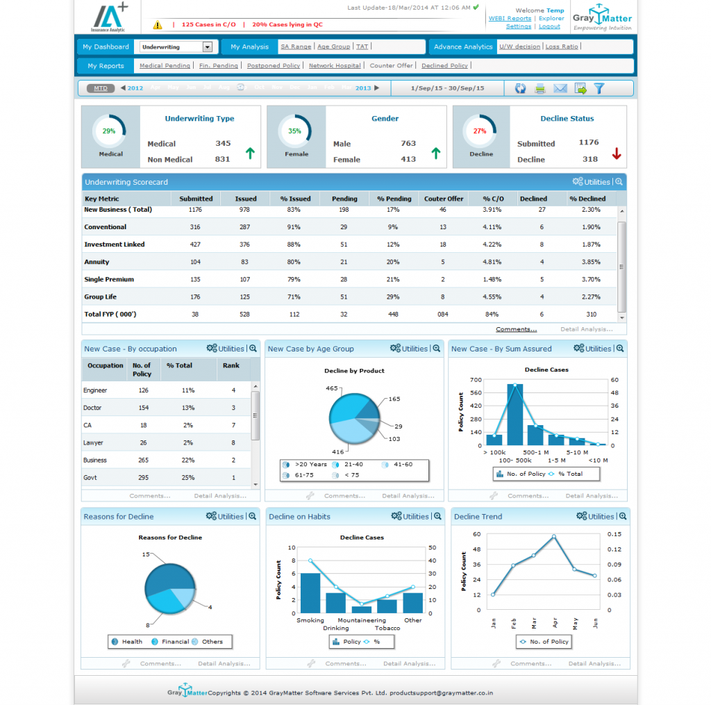 One of the most important parameter of operations head is to improve Operational efficiency by carefully improving each & every process from proposal submission to policy issuance. The Operations Head has to oversee the processing of large volume of Insurance Proposal with minimal turnaround time (TAT) and better efficiencies. GrayMatter’s IA+ Insurance Operations Analytics covers all the above mentioned areas.